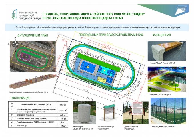 - Спортивное ядро в районе ГБОУ СОШ № 5 ОЦ «Лидер» (г. Кинель, ул. 27 Партсъезда, спортплощадка) 5 этап;