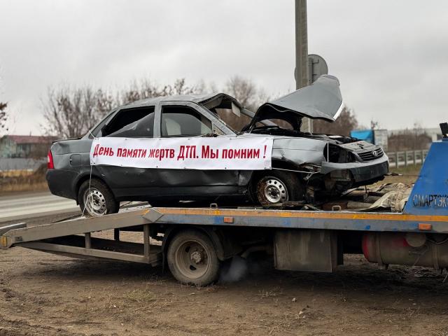 В канун Дня памяти жертв ДТП сотрудники Госавтоинспекции Кинельского и Волжского района провели мероприятие, направленное на повышение безопасности дорожного движения и привлечения внимания к проблеме аварийности на дорогах. Место проведенияакции было выбрано на границе айонов, где на эвакуаторе была устанолена раскуроченная машина после ДТП, ставшая символом трагедий, происходящих на дорогах с установленным баннером «День памяти жертв ДТП. Мы помним».