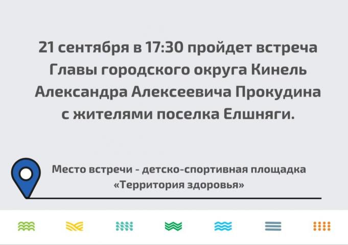 21 сентября в 17:30 пройдет встреча с жителями поселка Елшняги. Место встречи - детско-спортивная площадка «Территория здоровья».