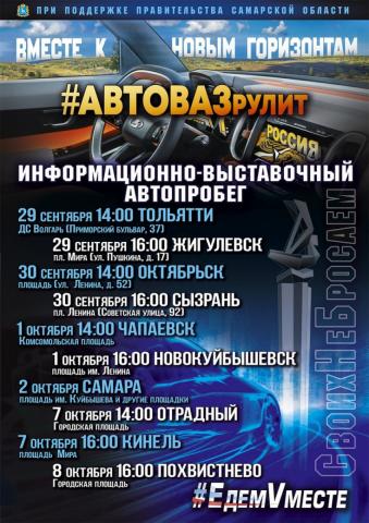 В Кинеле мероприятие пройдет 7 октября на площади Мира. С 16.00 на площади будут работать тематические площадки с интерактивной познавательной программой «АвтоВАЗ – ищет Вас», консультацией по вопросам трудоустройства и концертной программой с участием творческих коллективов городского округа. Здесь же пройдет торжественная встреча участников марафона «АвтоВАЗ рулит». Завершится мероприятие концертом с участием Андрея Сорокина.