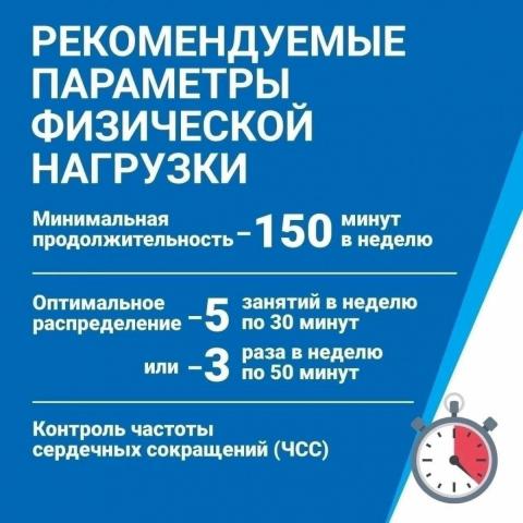 Рекомендуемый уровень физической нагрузки - не менее 150 минут в неделю – 3 раза по 50 или 5 раз по 30 минут.