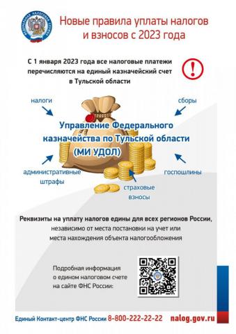 С 1 января 2023 года все налоги подлежат уплате Единым налоговым платежом на отдельный казначейский счет, открытый в Управлении Федерального казначейства по Тульской области (Межрегиональная инспекция Федеральной налоговой службы по управлению долгом). Данный счет применятся вне зависимости от места постановки на учет налогоплательщика или места нахождения объекта налогообложения.
