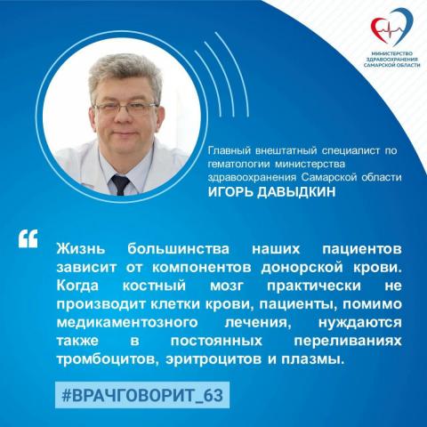 Главный гематолог Самарской области Игорь Давыдкин: «Жизнь большинства наших пациентов зависит от компонентов донорской крови»