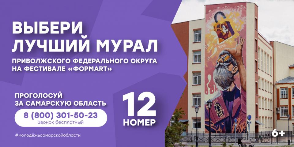 В рамках фестиваля стрит-арт Приволжского федерального округа «ФормART» проходит голосование за лучший мурал. Самарскую область представляет работа «Открытие возможностей» молодого самарского художника Дмитрия Пирога, которая расположена на фасаде школы № 12 имени Героя Советского Союза Ф. М. Сафонова на улице Красноармейской, 93а. Проголосовать за понравившуюся работу можно до 17 августа по бесплатному номеру 8 (800) 301-50-23, чтобы поддержать работу самарца необходимо в тональном режиме выбрать индивидуальный номер участника – №12.