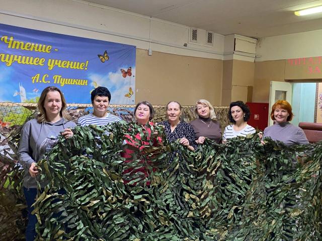 Новости → На базе библиотеки поселка Усть-Кинельский работает пункт сбора помощи участникам СВО, также там ежедневно собираются волонтеры, которые делают важную работу - плетут маскировочные сети