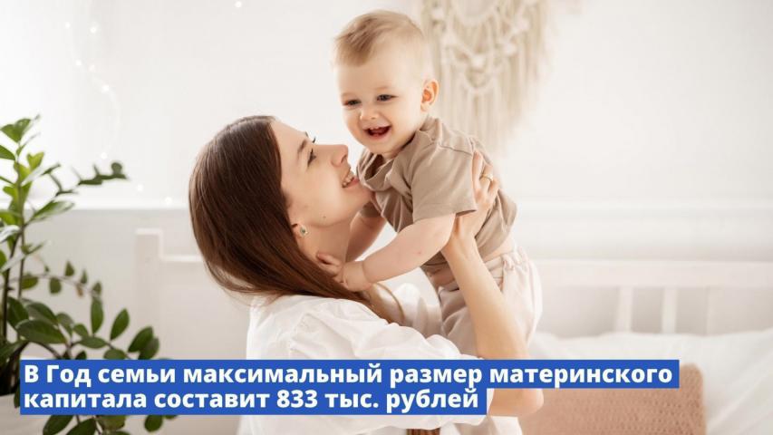 Новости → В Год семьи, объявленный Президентом России Владимиром Путиным, максимальный размер материнского капитала составит 833 тыс. рублей