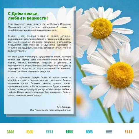В этот замечательный праздник желаем всем семьям городского округа любви и взаимопонимания, большого человеческого счастья, добрых, уважительных и отзывчивых отношений, заботливых детей и внуков!