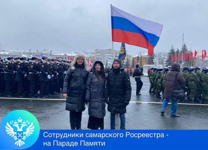 Сотрудники Самарского Росреестра приняли участие в мероприятиях, посвященных легендарному параду 7 ноября 1941 года, после которого бойцы Красной армии уходили защищать Родину от фашизма. Красной нитью Парада Памяти 2024 года стала тема «Наша семья — наша Победа».