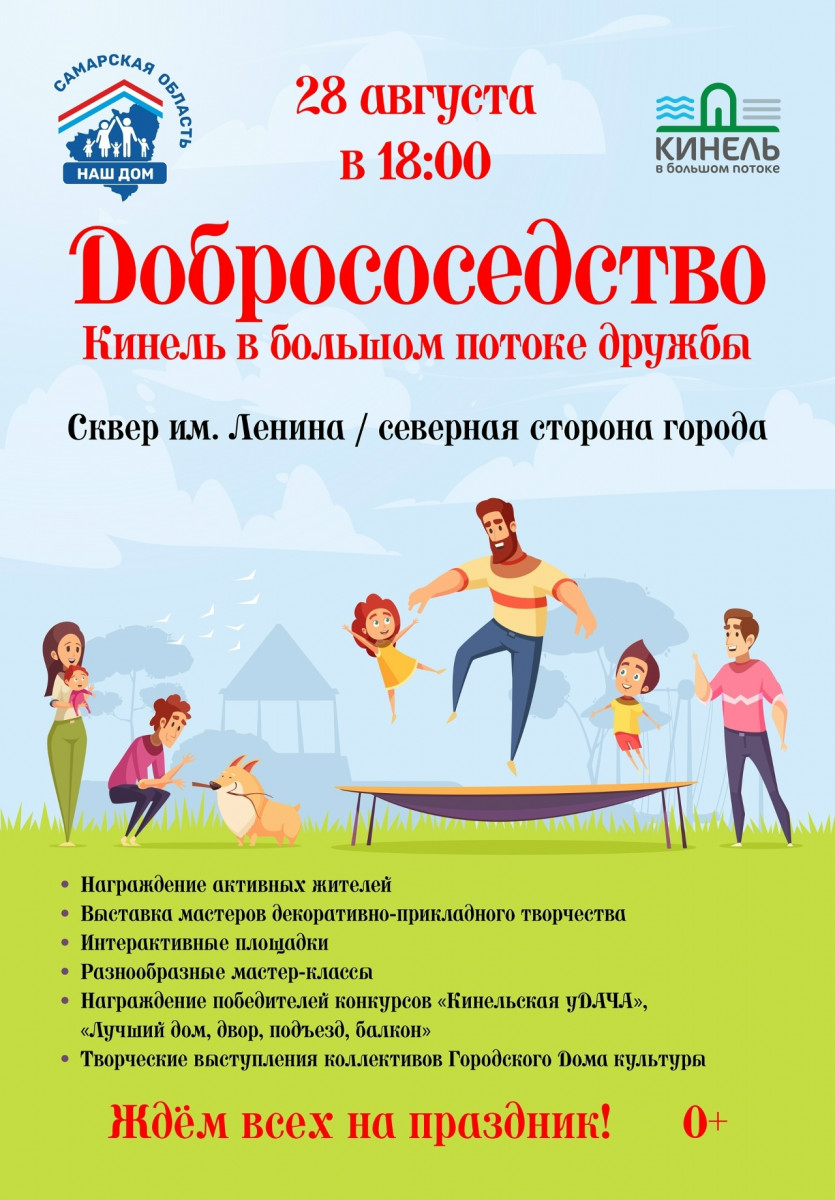 28 августа в 18:00 в сквере имени Ленина, на северной стороне города Кинель, состоится праздничная программа фестиваля «Добрососедство. Кинель в большом потоке дружбы». Это событие является частью регионального проекта «Самарская область – наш дом».