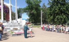 Воспитанники лагеря дневного пребывания «Орлёнок» из школы 11 и сотрудники 34-го пожарно-спасательного отряда под руководством Виктора Геннадьевича Зимина собрались в парке Победы около Вечного огня.
