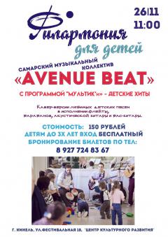 26 ноября в 11:00 Центр культурного развития (г. Кинель, ул. Фестивальная, 18) вновь откроет двери для самых юных слушателей. В рамках уже полюбившегося проекта «Филармония для детей» перед ребятами выступит самарский музыкальный коллектив AVENUE BEAT с обожаемой малышами программой "МУЛЬТИК'и - детские хиты". Кавер-версии любимых детских песен в исполнении флейты, барабанов, акустической гитары и бас-гитары.