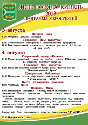 19.00. Праздничная программа «Город пишет биографию !», посвященная 55-летию присвоения Кинелю статуса города областного подчинения