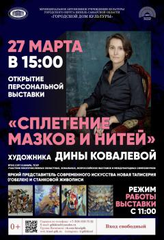27 марта в Городском Доме культуры состоится открытие персональной выставки художника Дины Ковалевой «СПЛЕТЕНИЕ МАЗКОВ И НИТЕЙ».