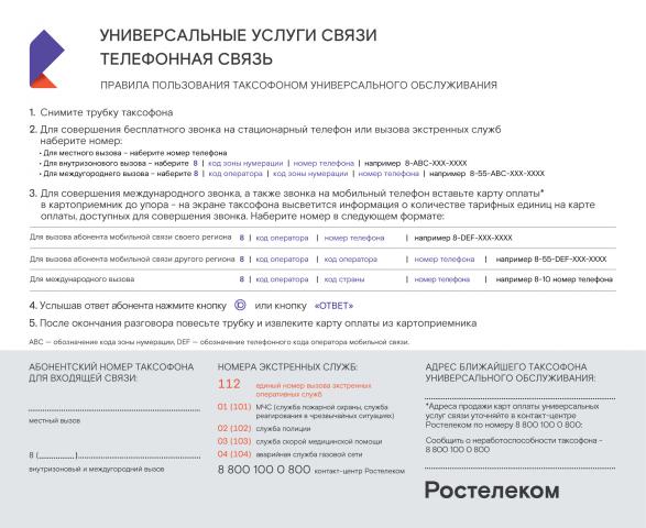 «Ростелеком», являясь единственным оператором универсального обслуживания в РФ, обеспечивает функционирование 148 тыс. универсальных таксофонов, в том числе в удаленных и труднодоступных малых населенных пунктах. Всего таксофоны установлены в 131 тыс. населенных пунктов страны, из них 118 тыс., или 80% от общего количества — это поселки, села, деревни, станицы и аулы с населением менее 500 человек.