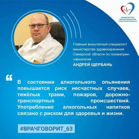 «В состоянии алкогольного опьянения повышается риск несчастных случаев, тяжёлых травм, пожаров, дорожно-транспортных происшествий. Употребление алкогольных напитков связано с риском для здоровья и жизни. Употребление этанола приводит к тому, что человек не может адекватно оценивать свои поступки и зачастую делает то, на чтобы никогда не отважился в трезвом виде. Происходит это за счёт угнетения центров головного мозга человека, отвечающих за управление поведением. Работа нервной системы человека основывается на двух сбалансированных процессах: возбуждении и торможении. Этанол влияет на процесс торможения. Даже самая маленькая концентрация этого опасного вещества в крови вызывает колоссальное влияние на головной мозг. В результате изменяются поведенческие реакции человека, возникает риск появления хронических заболеваний, острых состояний, получения травм различной степени тяжести. Развею ещё один, пожалуй, самый важный миф о якобы безопасных дозах употребления спиртного. Особо подчеркну: безопасных доз алкоголя для человека не существует. Исключить влияние на организм этанола можно только одним способом – не употреблять спиртосодержащие напитки», — подчеркнул Андрей Валерьевич.