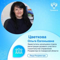 Дипломированный режиссер и актер, преподаватель и организатор. Да, такие специалисты работают в большом коллективе Росреестра. Цветкова Ольга Евгеньевна, заместитель начальника отдела регистрации долевого участия в строительстве – один из ярких представителей Управления Росреестра по Самарской области. С ее профессионализмом и опытом связано успешное развитие отрасли, в частности, благодаря плодотворному взаимодействию с представителями профессионального сообщества. Рабочие встречи, семинары-совещания с застройщиками, осуществляющими свою деятельность на территории города Самары, дали свои плоды. Так в октябре 2023 года Самарская область достигла показателя 89,3% по представленным в электронном виде ДДУ и с таким результатом заняла второе место в Приволжском Федеральном округе.