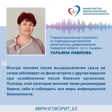 Рассказывает главный внештатный специалист по инфекционным болезням г.о. Сызрань, заведующая инфекционным отделением Сызранской центральной городской и районной больницы Татьяна Павлова: