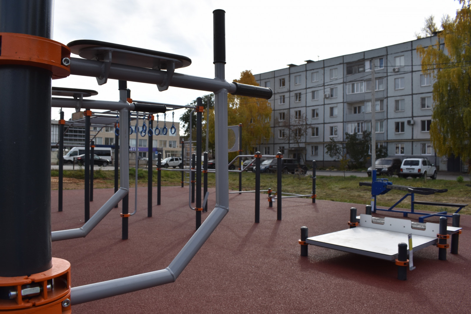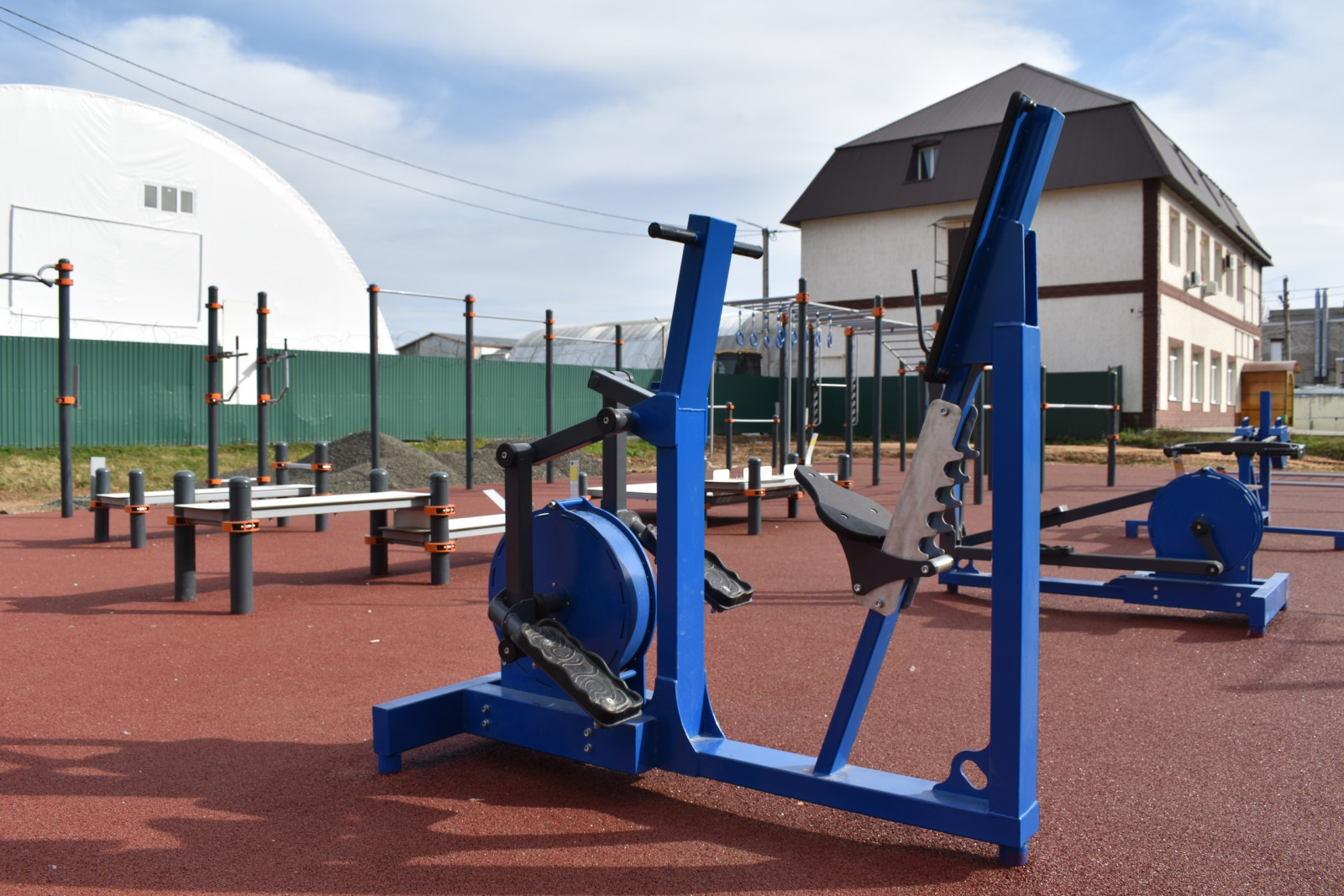 Новая площадка разместилась во дворе многоквартирного дома и вместила в себя комплекс спортивного оборудования, предназначенного для разноплановых тренировок. Силовые тренажеры, разноуровневые турники и перекладины, рукоходы, гимнастические кольца, тумбы для наклонов с положения сидя и стоя, большое кольцо с сеткой для отработки меткости и не только.